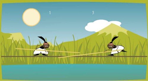 Poražte a shodte do vody svého soupere v souboji s bambusovými tycemi. Bojovníka ovládáte myší, klikáním nad nej, pod nej nebo na jeho telo.