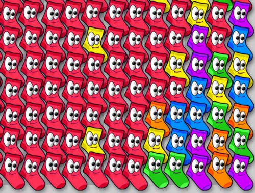 Trídení ponožek podle barev je strašlivá otrava, rešení je obarvení fusek na jednu barvu. Ponožky se barví jedna od druhé ve speciálním zarízení. Mackejte barevné cudlíky a ponožky se budou obarvovat. Hra se hraje myší.