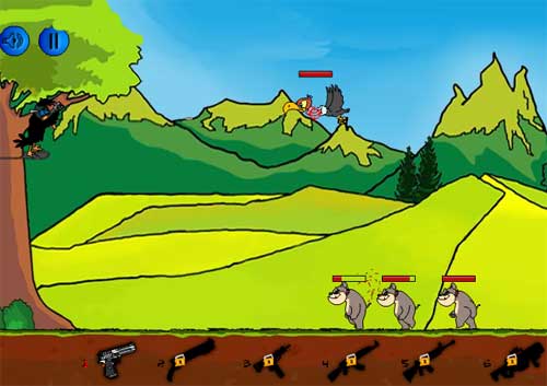 Terorista v podobe vrány ohrozuje obyvatele lesa. Z vysokého stromu je normálne likviduje. Mezi levely upgraduje a nakupuje zbranme. Hra se hraje myší.