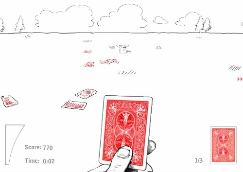 Snažte se strefit se všemi svými kartami do klobouku. Dobre, tak alespon jednou. Vzdálenost i smer hodu urcujete myší.